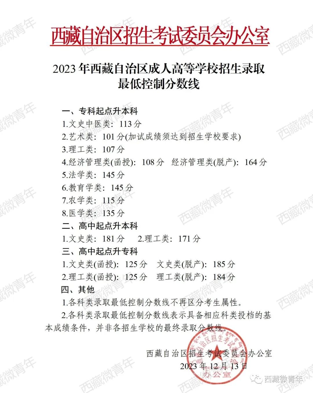 2023年西藏自治區成人高等學校招生錄取最低控制分數線