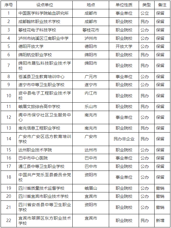 根據教育部《關于做好2024年度高等學歷繼續教育專業和校外教學點設置與管理工作的通知》(教職成司函〔2023〕29號)及四川省教育廳辦公室《關于做好2024年度高等學歷繼續教育專業和校外教學點設置與管理工作的通知》(川教廳辦函〔2023〕30號)精神,結合2023年我校各教學點的基本情況,2024年1月2日校長辦公會研究,同意2024保留中國醫學科學院輸血研究所等18個校外教學點、撤銷四川省質量技術監督學校等3個校外教學點,宜賓市翠屏區東方職業技術學校作為新增校外教學點上報四川省教育廳備案,現予以公示。