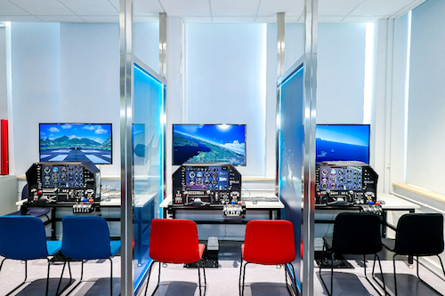 圖為:“波音·牛頓飛行學院”教室、全動態模擬飛行器、飛行平板