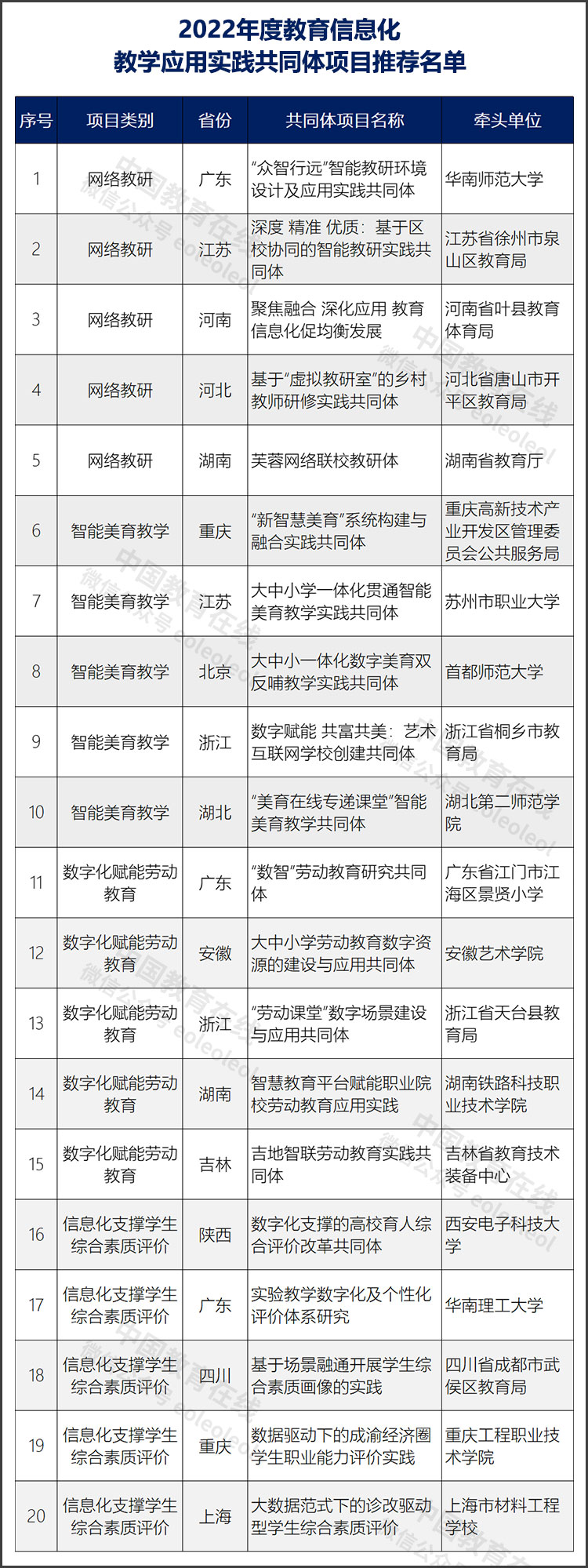 近日,教育部公示了2022年度教育信息化教學應用實踐共同體項目名單。20個來自網絡教研、智能美育教學、數字化賦能勞動教育、信息化支撐學生綜合素質評價共四類應用模式的實踐共同體上榜,公示期為2023年3月17日—24日。