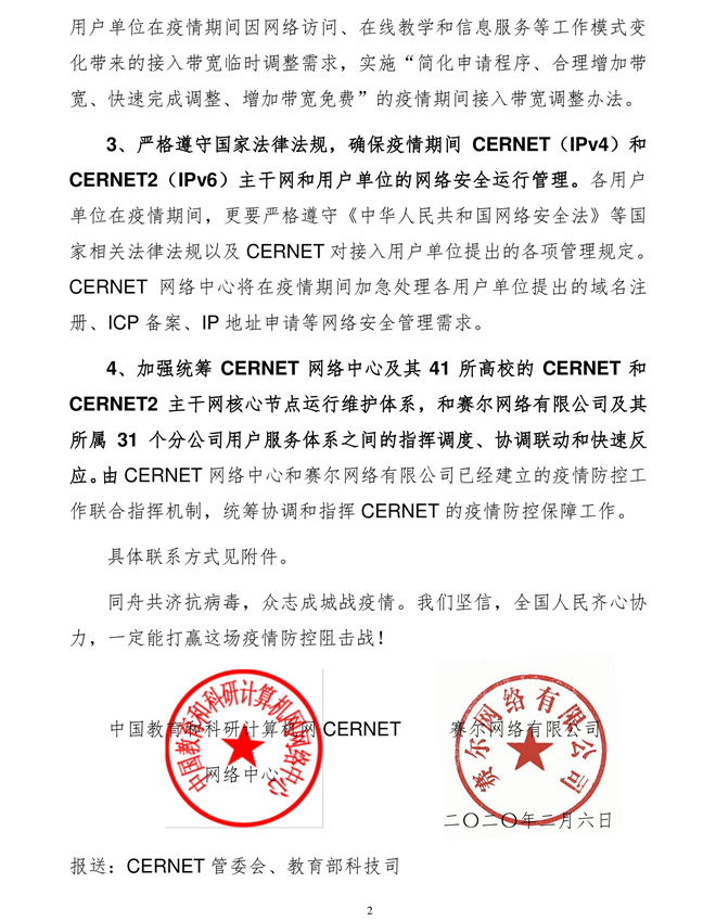 2、免費調整疫情期間CERNET用戶單位和CERNET(IPv4)和CERNET2(IPv6)主干網的接入帶寬需求;