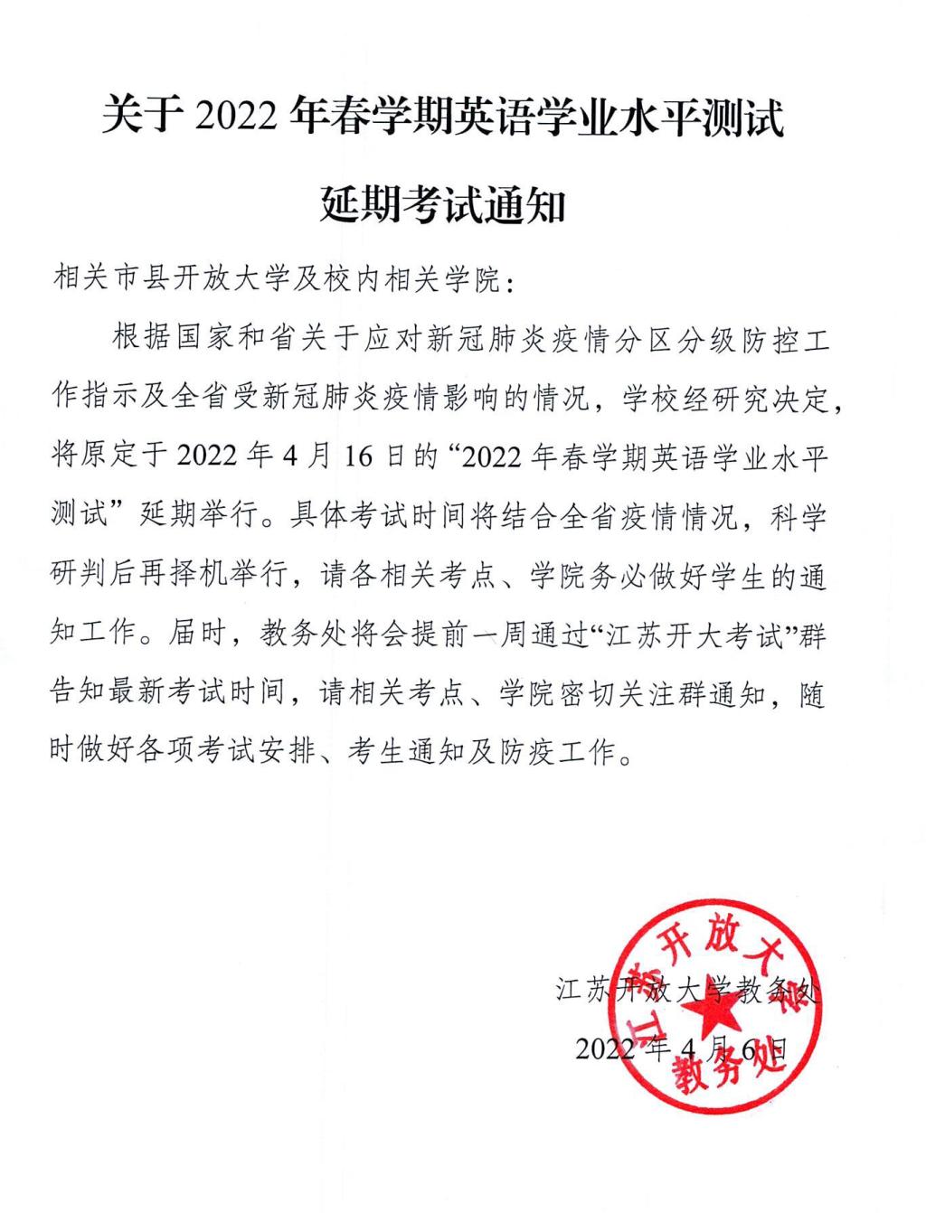 現發布《2022年春學期英語學業水平測試延期考試通知》,請各位老師根據文件內容,做好學生通知工作,最終的考試安排以群內通知為準。