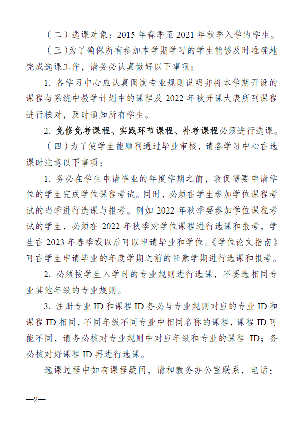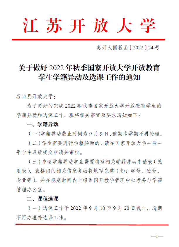 關于做好2022年秋季國家開放大學開放教育學生學籍異動及選課工作的通知