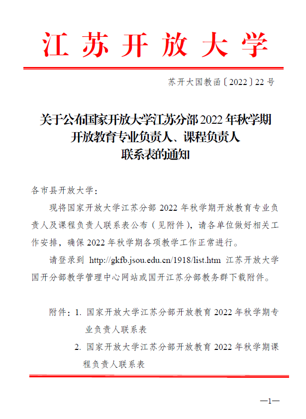 關于公布國家開放大學江蘇分部2022年秋學期開放教育專業負責人、課程負責人聯系表的通知