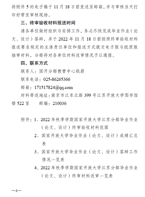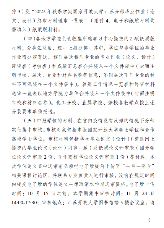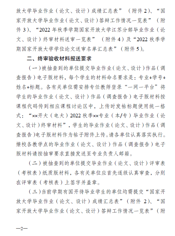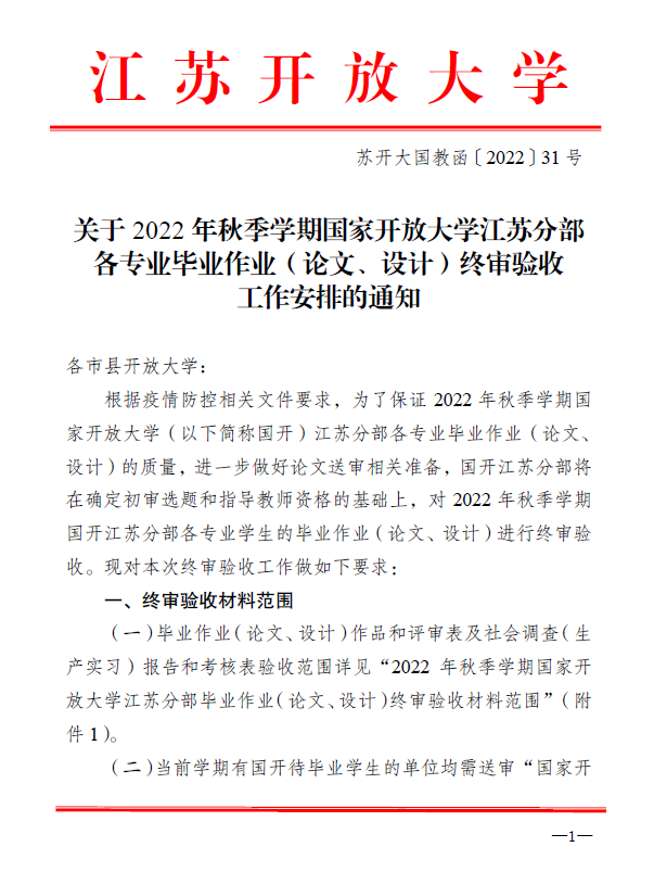 關于2022年秋季學期國家開放大學江蘇分部各專業畢業作業(論文、設計)終審驗收工作安排的通知