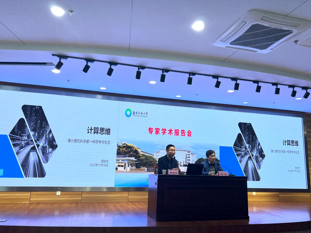周浩杰博士基于數字化時代大背景,深入淺出地向同學們講述了“計算思維”的多重維度。首先,通過“渡河問題”、“小白鼠檢測毒水瓶實驗”、“百元買百雞”等通俗易懂的數學問題引導同學們思考人的計算與機器自動計算的差別,使同學們明白計算機背后的計算思維與邏輯;隨后,通過對過去、現在、未來計算工具的展示以及計算機在人們日常生活中的運用,使同學們系統了解計算工具的多樣性與普遍性;最后,圍繞“數字時代”、“科技壁壘”、“信息化”等社會熱點問題向同學們闡述了當前數字經濟新動能、數字化人才模型以及數字化人才供需等情況,告訴同學們作為信息時代的原住民,要掌握包括邏輯思維、算法思維、系統思維、網絡思維等在內的計算思維,才能適應時代的發展。