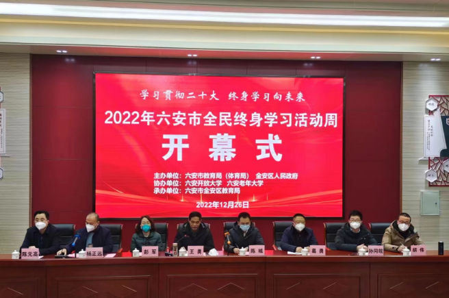2022年12月26日,全民學習活動周啟動儀式在六安市毛坦廠中學實驗學校隆重舉行,本次活動由六安市教體局、金安區人民政府主辦,六安開放大學、六安老年大學協辦,六安市金安區教育局承辦。