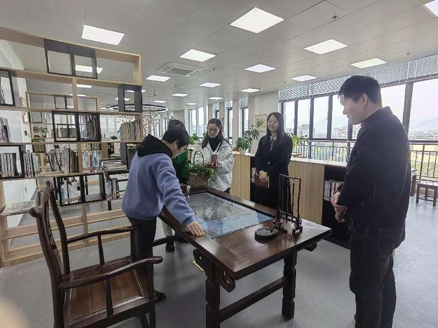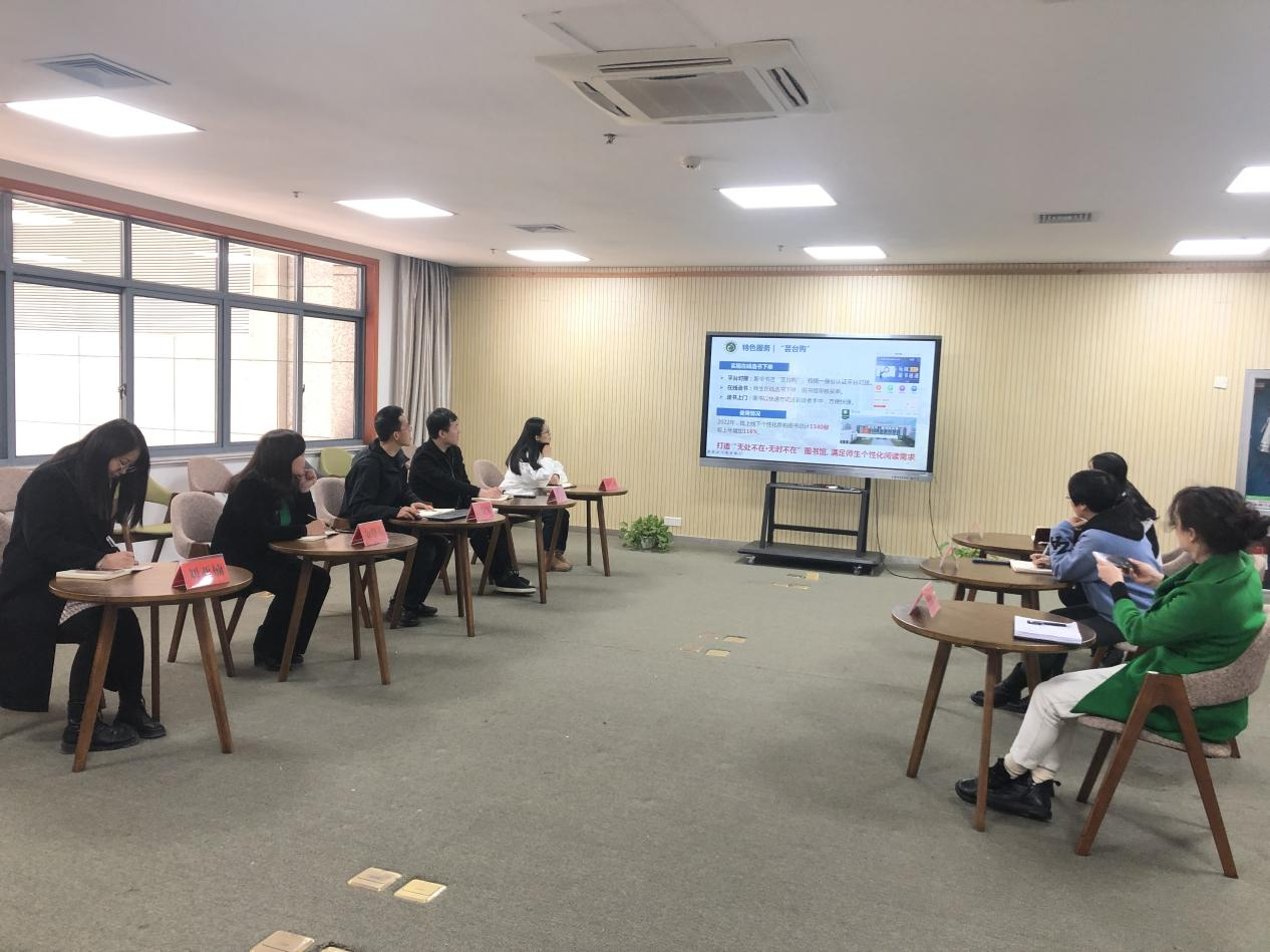考察組參觀了嘉木書吧、拾.工坊、嘉木影院等特色空間,并開展座談交流。臺州科技職業學院信息中心(圖書館)詳細介紹了特色服務、嘉木系列、空間理念、微信公眾號等方面經驗做法,雙方就“蕓臺購”“書店借”、自助借還、電子書等方面工作進行深入交流。