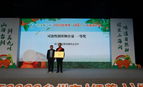 作為椒江區浙江新佳果柑橘專業合作社理事長,選送的產品“紅美人”在“臺九鮮”杯2022臺州市“紅美人”柑橘擂臺賽中,奪得了可溶性固形物含量項目的擂主“寶座”。