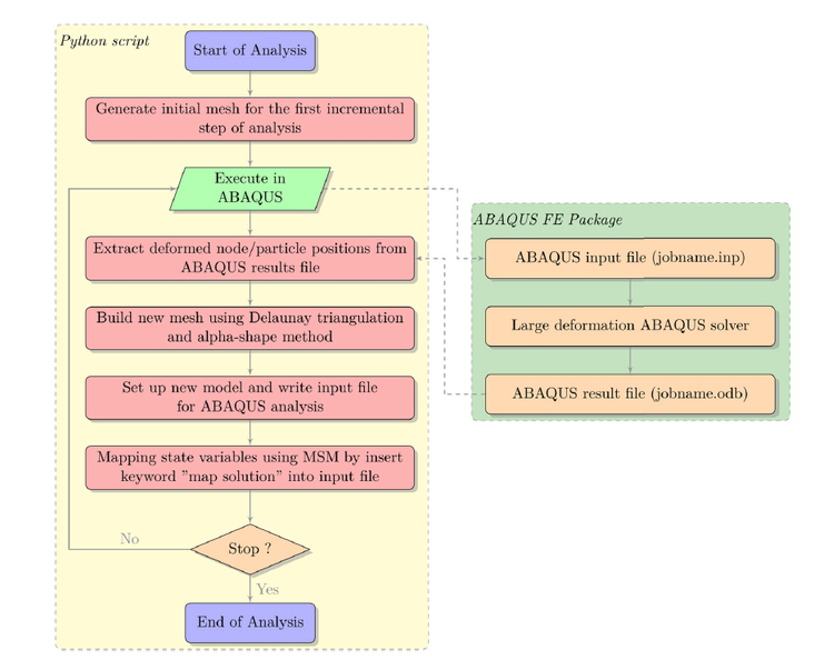 粒子有限元法將有限元網格中的節點視為自由粒子,根據分析步的位移增量更新粒子的位置,并通過周期性的計算域重新識別和網格重新剖分解決傳統有限元法存在的網格扭曲問題,能有效的實現巖土大變形數值模擬。研究采用Abaqus的內置函數進行常規增量FEM分析,并使用mesh-to-mesh mapping方法實現場變量的映射,使用單個Python腳本就能實現PFEM數值模擬,顯著減少了編碼工作量,為PFEM在巖土工程中的推廣應用奠定了基礎。