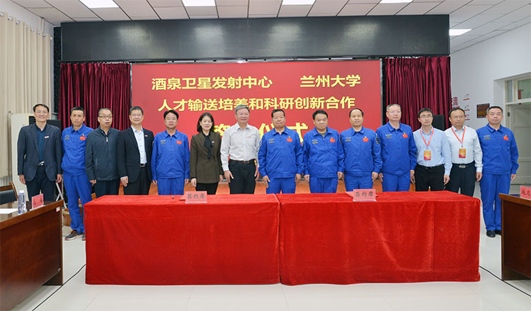 5月30日,蘭州大學校長嚴純華一行赴酒泉衛星發射中心推進合作,簽署校地人才培養和科研創新合作協議。酒泉衛星發射中心黨委書記姜漢民、副主任路春福、總工程師鄭永煌、安全部主任劉惠斌,中國科學院院士、蘭州大學校長嚴純華,副校長曹紅出席簽約儀式。
