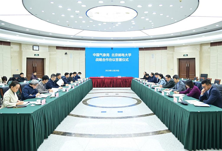 12月29日,北京郵電大學與中國氣象局戰略合作協議簽署儀式在中國氣象局舉行。中國氣象局黨組書記、局長陳振林,黨組成員、副局長熊紹員,北京郵電大學黨委書記續梅,黨委副書記、校長徐坤,黨委常委、副校長蘇森出席簽約儀式。