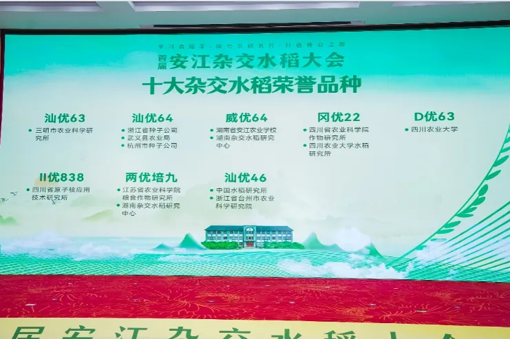 一粒良種,萬擔好糧。50多年來,雜交稻育種取得了一系列豐碩成果,育成了一批大面積推廣的雜交稻品種,為保障糧食安全作出了突出貢獻,大會依據《全國農作物主要品種推廣情況統計》,對1985年至2023年累計推廣面積進行分析排序,經專家組評議并于會上發布了“十大雜交水稻榮譽品種”,汕優63、汕優64、威優64、岡優22、D優63、Ⅱ優838、兩優培九、汕優46、汕優6號、金優207獲殊榮。十個品種中有兩個為四川農業大學水稻研究所選育或參加選育,分別是D優63(四川農業大學水稻研究所選育)、岡優22(四川省農科院作物研究所與四川農業大學水稻研究所共同選育)。