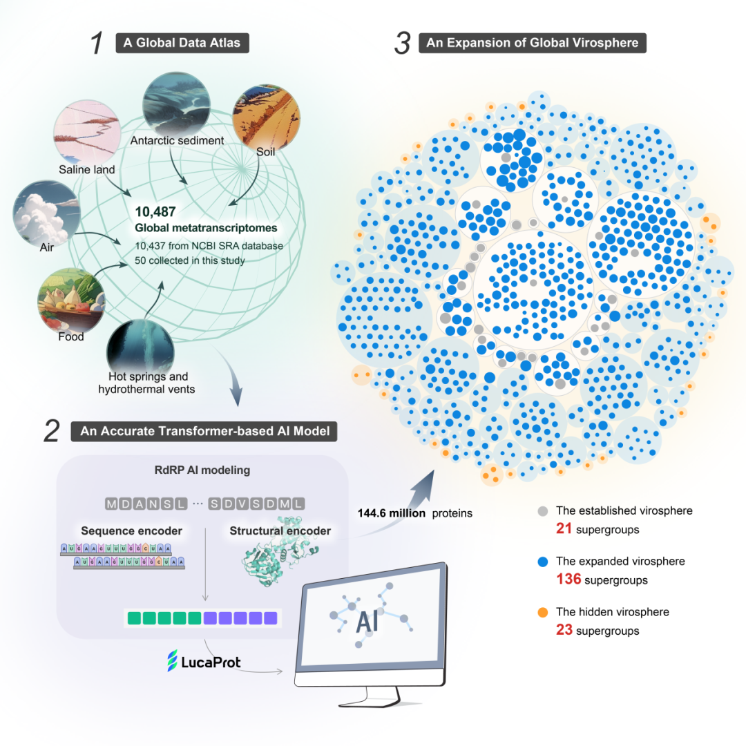 10月9日,中山大學醫學院施莽教授團隊與阿里云李兆融團隊在《細胞》(Cell)雜志上發表論文,報告了180個超群、超過16萬種全球RNA病毒的發現。這是迄今為止規模最大的RNA病毒研究,大幅擴展了全球RNA病毒的多樣性。該研究將人工智能技術應用于病毒鑒定,發現了傳統方法未能發現的病毒“暗物質”,探索了病毒學研究的新路徑。