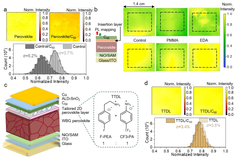 圖1. 寬帶隙鈣鈦礦中界面均一化策略的提出。a, C??沉積前后鈣鈦礦表面的光致發光圖與強度分布;b, 含有不同插入層的鈣鈦礦堆疊的光致發光圖像;c, 定制的二維鈣鈦礦策略示意圖;d, 含定制的二維鈣鈦礦插入層的C??沉積前后鈣鈦礦表面的光致發光圖與強度分布。