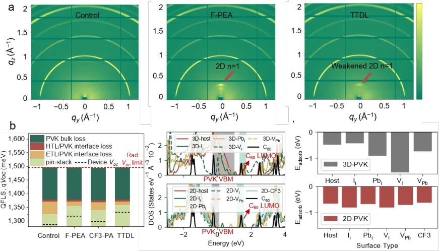 圖2. 定制的二維鈣鈦礦的作用機制。a, 不同后處理分子的鈣鈦礦表面GI-WAXs圖譜;b, 含有不同插入層的鈣鈦礦堆疊中的性能損失分析;c, 二維鈣鈦礦與三維鈣鈦礦表面的能級分析;d, 含不同點缺陷的二維鈣鈦礦與三維鈣鈦礦表面與C??的吸附能分析。