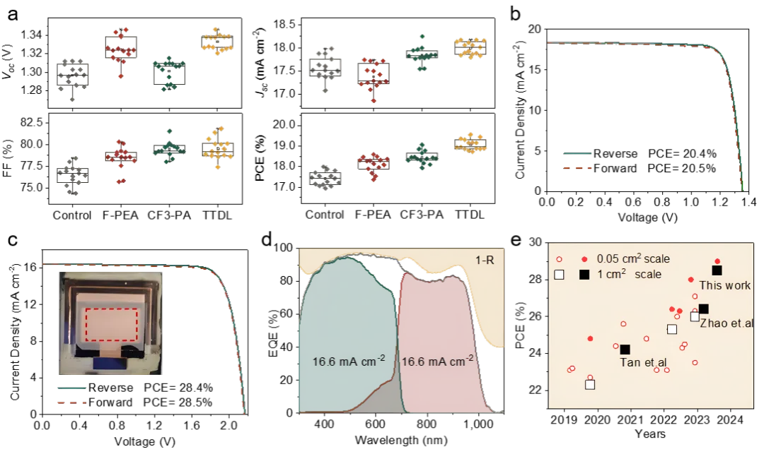 研究團隊進一步地將優化后的寬帶隙鈣鈦礦用于制備全鈣鈦礦疊層太陽電池。在活性區域為1.05 cm2的全鈣鈦礦疊層太陽電池中,實現了28.5%的轉化效率(如圖3c所示)。EQE顯示的匹配電流為16.6 mA cm?2,與當前最佳的小面積全鈣鈦礦疊層太陽電池的數值相當,意味著在面積擴大時沒有發生明顯的電流損失(如圖3d所示)。