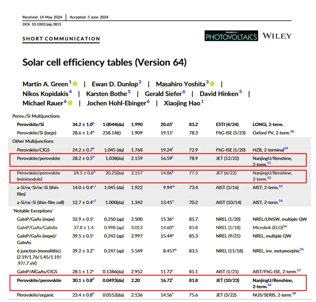圖4. 最新太陽能電池世界紀錄效率表(疊層電池部分)。《Solar cell efficiency tables》是由“太陽能之父”Martin Green教授與美、日、意、澳等多國科學家聯合編撰的國際權威榜單,代表了全球光伏領域的最前沿水平。