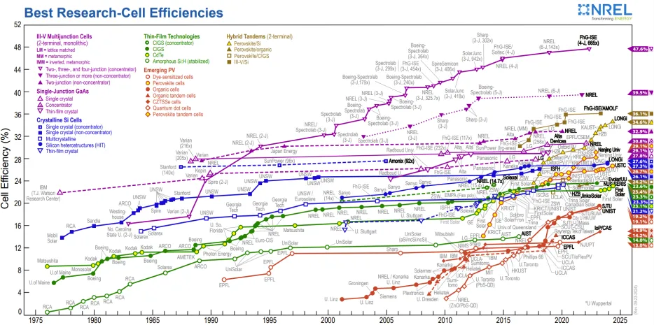 圖5.美國國家可再生能源實驗室發布的“最佳太陽電池效率”表。