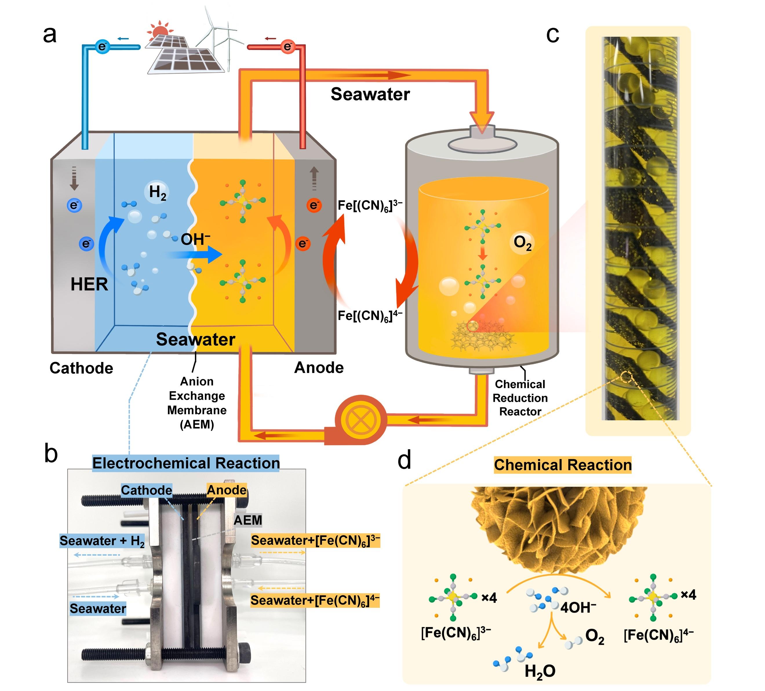 不同于2022年11月謝和平院士團隊Nature正刊上提出的相變遷移海水直接電解制氫顛覆性原理技術,該研究是謝和平院士團隊圍繞海水中的氯離子引發副反應和電極腐蝕現象,提出的另一種新的解耦式海水直接電解制氫策略。論文系統研究了鐵氰酸根/亞鐵氰酸根電對([Fe(CN)6]3?/4?)在真實海水體系下可逆氧化還原特性,探明了電解系統陰極析氫反應與陽極亞鐵氰酸根氧化反應的高效性,厘清了解耦體系下氧氣自發穩定產出的反應機理,實現了全新系統在真實海水環境下250小時的長時間穩定。該項原理技術巧妙規避了海水中氯離子對電解制氫反應的干擾,充分驗證了解耦式海水直接電解制氫系統在復雜海水環境下的抗腐蝕性與對氯離子副反應的應用潛力,將有助于豐富和進一步構建破解海水復雜成分影響的海水電解制氫理論體系和技術框架。