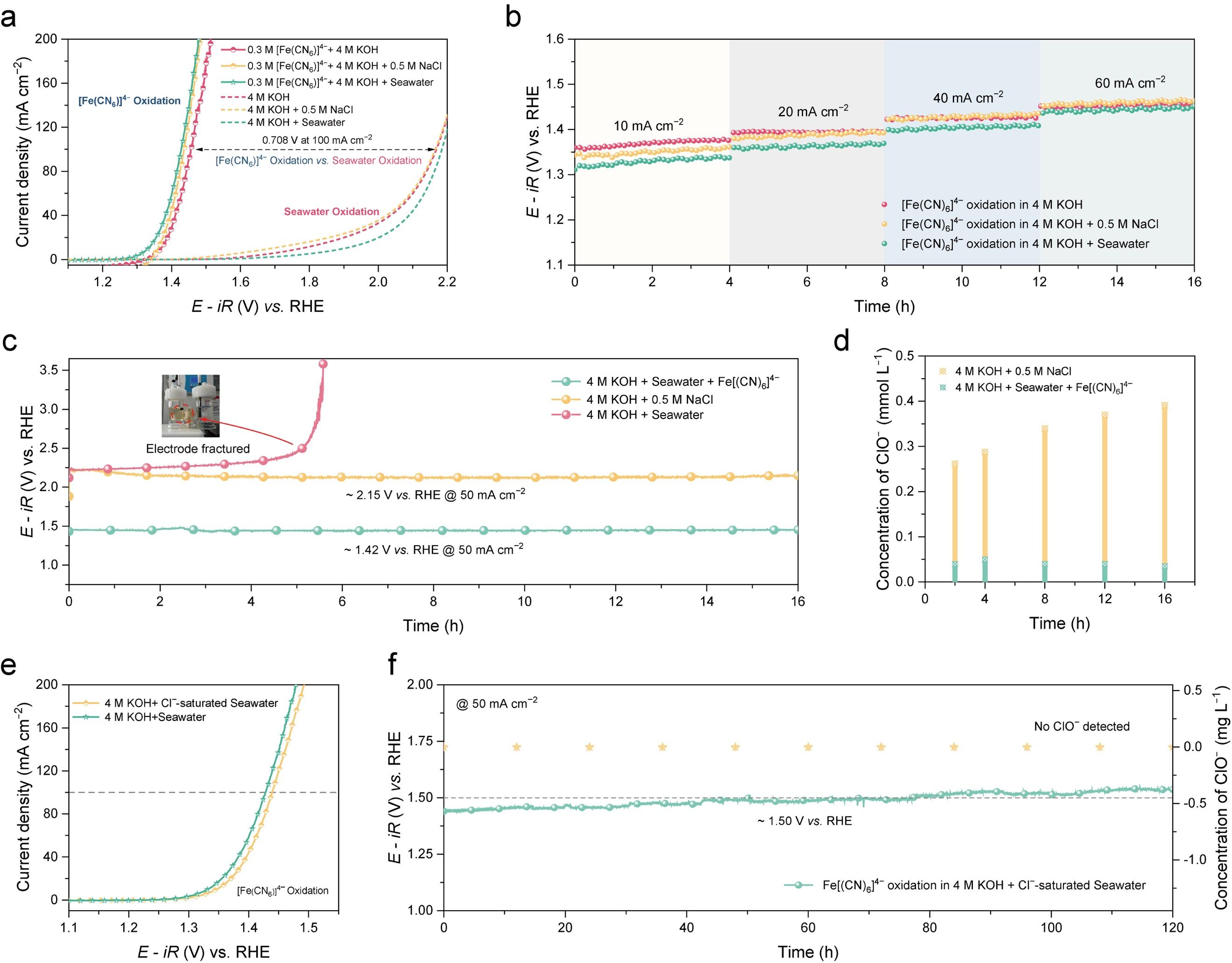該研究針對海水制氫中最棘手的氯離子干擾難題,引入氧化還原介導的解耦策略,利用兼具熱力學和動力學優勢的陽極反應,巧妙規避了傳統電解水制氫過程中析氧反應與氯離子反應的直接競爭,大幅降低了電化學腐蝕。在該研究中,[Fe(CN)6]3?/4?電對在在海水中不僅保持了優異的可逆氧化還原動力學特性,而且在200 mA cm?2的接近工業級電流密度下實現了超過250小時的長時間穩定運行。