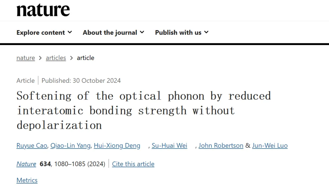 10月30日,寧波東方理工大學(暫名)物理學院院長、講席教授魏蘇淮,聯合中國科學院半導體研究所駱軍委研究員、鄧惠雄研究員研究組,以“通過降低原子化學鍵強度誘導的光學聲子軟化避免退極化效應(Softening of the optical phonon by reduced interatomic bonding strength without depolarization)”為題的論文,發表在《Nature》雜志。