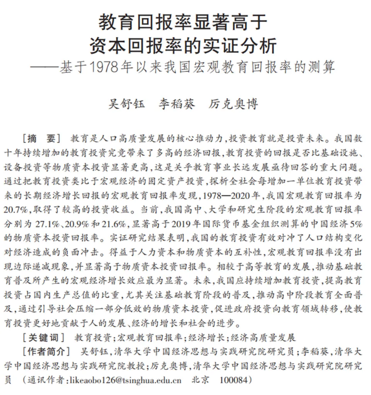 成果名稱:教育回報率顯著高于資本回報率的實證分析——基于1978年以來我國宏觀教育回報率的測算