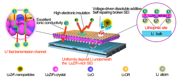 針對以上難點,研究團隊基于理論計算,驗證了以t-Li2ZrF6晶體構建理想型固態電解質界面的可行性,首次提出用電場驅動m-Li2ZrF6轉化為t-Li2ZrF6來構筑固態電解質界面的策略。相關實驗表明,這一策略不僅能夠憑借優異的電子絕緣性阻止電子擊穿固態電解質界面進而抑制電解液的分解,還能夠為Li+ 提供快速遷移的通道,提高鋰金屬電池的倍率性能。此外,t-Li2ZrF6晶體表面豐富的親鋰位點能夠和其內部的離子通道一起,誘導鋰金屬均勻沉積,抑制鋰枝晶的生長,從而提高鋰金屬電池的安全性。同時,過量m-Li2ZrF6添加劑不僅能夠改善傳統添加劑在循環中被耗盡的缺陷,還能夠通過ZrF62-離子及時修復破損的固態電解質界面,為鋰金屬負極的界面穩定性提供長期保護。