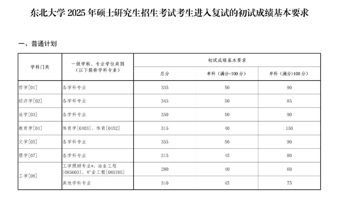 東北大學2025年碩士研究生招生考試考生進入復試的初試成績基本要求