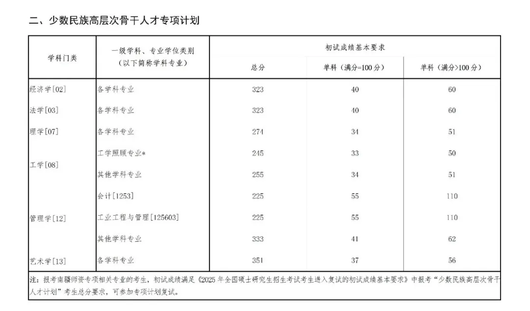 2.享受少數民族照顧政策的考生(指工作單位和戶籍在國務院公布的民族區域自治地方,且定向就業單位為原單位的少數民族在職人員考生),須在網上報名時按要求填報相關信息,并如實填寫少數民族身份及定向就業少數民族地區。未按規定申報的,不享受相應照顧政策。已按規定申報的考生,須在2025年3月15日前將相關證明和證件掃描件發送到研招辦郵箱(neuyzb@mail.neu.edu.cn)。學校將根據考生材料和上級部門反饋的名單進行審核。審核通過者按照學校復試基本分數線基礎上總分降10分,單科降5分。