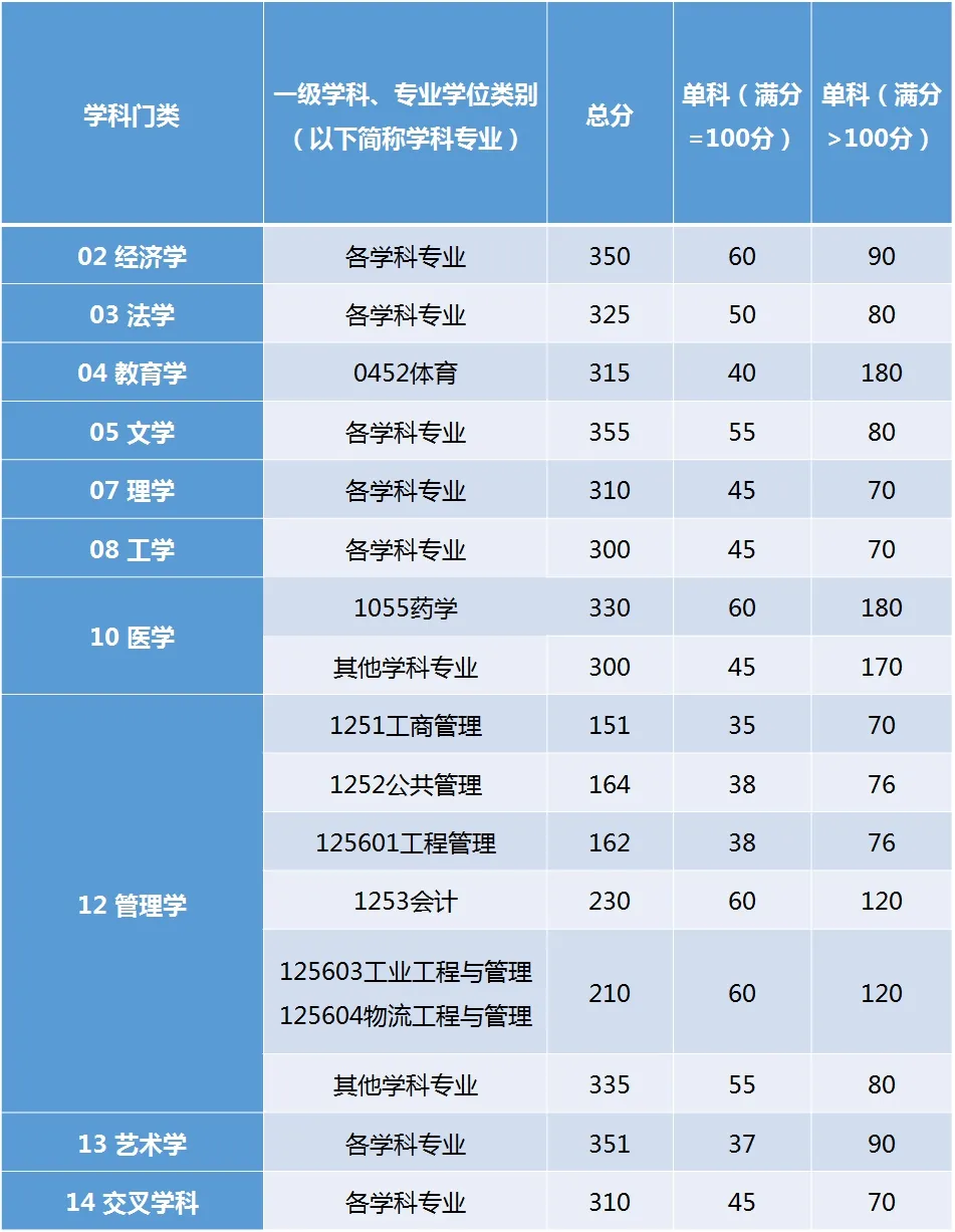 三、報考“退役大學生士兵”計劃的考生,初試成績不低于所報考專業A類考生國家線,按照考生總分與報考學科基本要求(見上表)的差值排序(初試滿分300分制的專業折算成500分制),由高到低通知復試。