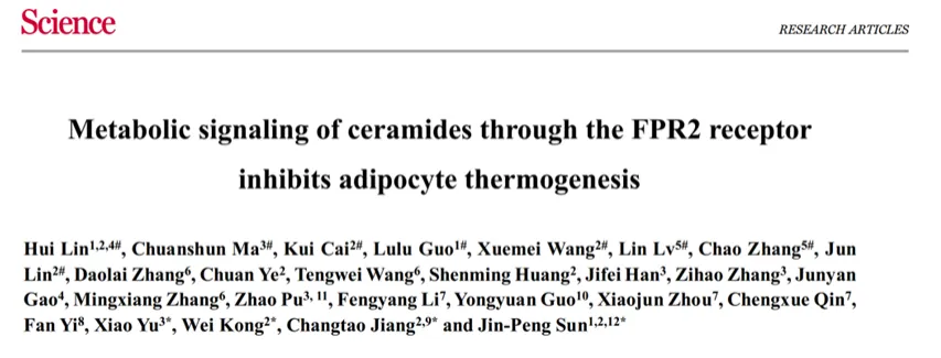 3月14日,山東大學基礎醫學院孫金鵬教授團隊,聯合北京大學醫學部基礎醫學院姜長濤教授和孔煒教授團隊、山東大學于曉教授團隊,在《科學》(Science)在線發表研究論文“Metabolic signaling of ceramides through the FPR2 receptor inhibits adipocyte thermogenesis”。