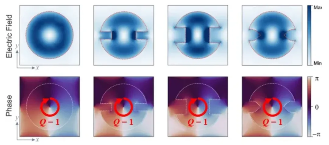 具有對結構微擾免疫的拓撲共振模式。其電場分布在結構中心呈現一個奇點,相位分布具有非平庸拓撲荷,不受結構微擾的影響
