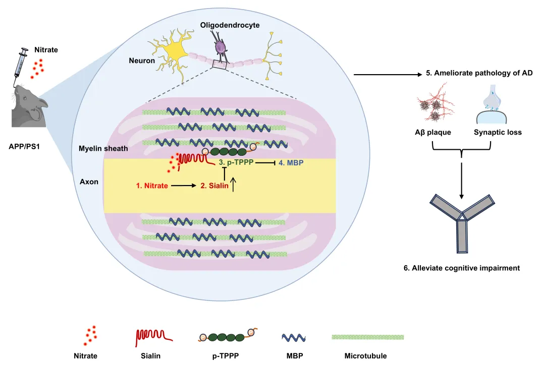 上述研究揭示了硝酸鹽通過上調神經元Sialin,降低AD模型小鼠海馬TPPP的磷酸化,進而改善其髓鞘丟失并緩解AD病理和認知障礙,同時闡明Sialin與TPPP結合的具體位點,該研究為AD治療靶點和治療策略的開發提供重要理論依據。