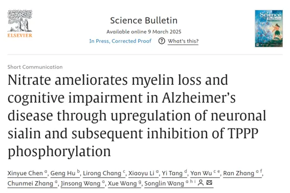 近日,首都醫科大學基礎醫學院口腔健康北京實驗室王松靈院士團隊在《Science Bulletin》上發表題為“Nitrate ameliorates myelin loss and cognitive impairment in Alzheimer's disease through upregulation of neuronal sialin and subsequent inhibition of TPPP phosphorylation”的研究論文。該研究發現硝酸鹽顯著緩解阿爾茨海默病(AD)模型小鼠髓鞘丟失并有效改善其認知障礙,并揭示硝酸鹽上調神經元硝酸鹽轉運蛋白(Sialin),進一步降低AD模型小鼠海馬促微管蛋白聚合蛋白(TPPP)的磷酸化是其緩解AD的機制,該研究為AD治療靶點和治療策略的開發提供重要理論依據。首都醫科大學基礎醫學院口腔健康北京實驗室博士后陳欣月為第一作者,王松靈院士為通訊作者。