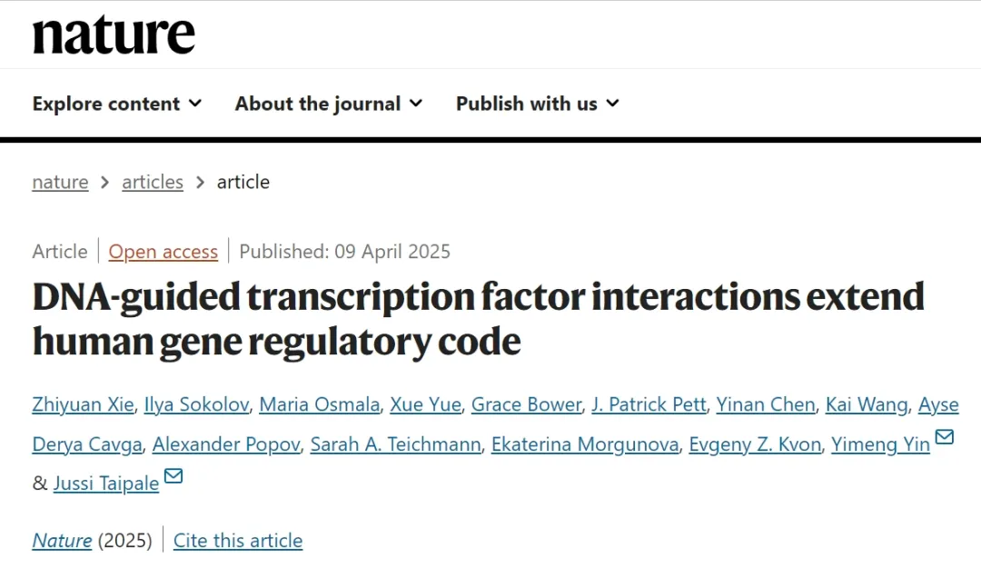 北京時間4月9日23時,同濟大學醫學院、同濟大學附屬東方醫院心臟病全國重點實驗室尹貽蒙研究團隊與劍橋大學研究團隊合作研究成果在線發表于《自然》(Nature)雜志,論文題為“DNA-guided transcription factor interactions extend human gene regulatory code“(DNA介導的轉錄因子間協同作用延展了人類基因調控密碼)。