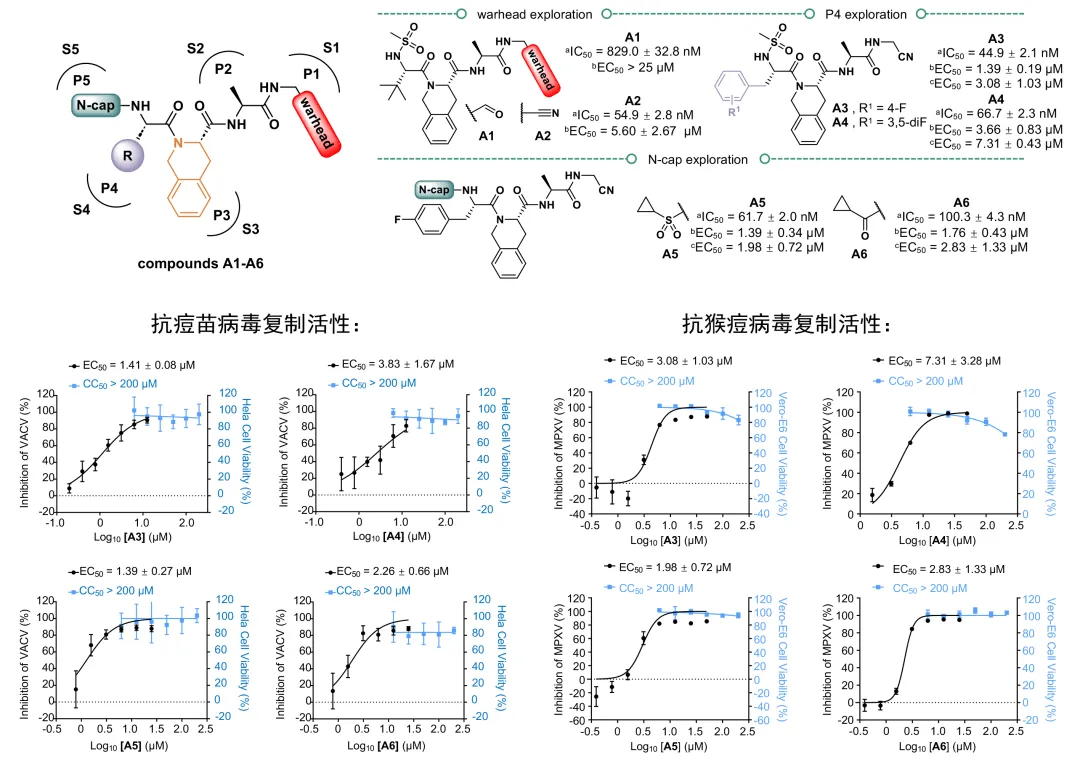 以核心蛋白酶的底物識別機制為基礎,研究團隊設計合成了一系列擬肽類抑制劑,其中A3-A6具有高效的病毒核心蛋白酶抑制活性(IC50范圍:44.9 nM~100.3 nM),且表現出較強的抗猴痘病毒活性(EC50范圍:1.98 μM~7.31 μM)和抗痘苗病毒活性(EC50范圍:1.39 μM~3.66 μM),同時具有良好的安全性(CC50大于200 μM)。研究人員解析了抑制劑A3與核心蛋白酶的復合物結構,他們發現A3不僅可以與蛋白酶的催化中心的Cys328形成共價鍵,還可以利用其化學修飾基團同底物結合口袋的氨基酸殘基形成額外的氫鍵相互作用,以增強其結合能力。這些研究結果表明了化合物A3-A6在后續開發廣譜抗痘病毒抑制劑上的具有巨大潛力,是良好的先導化合物。