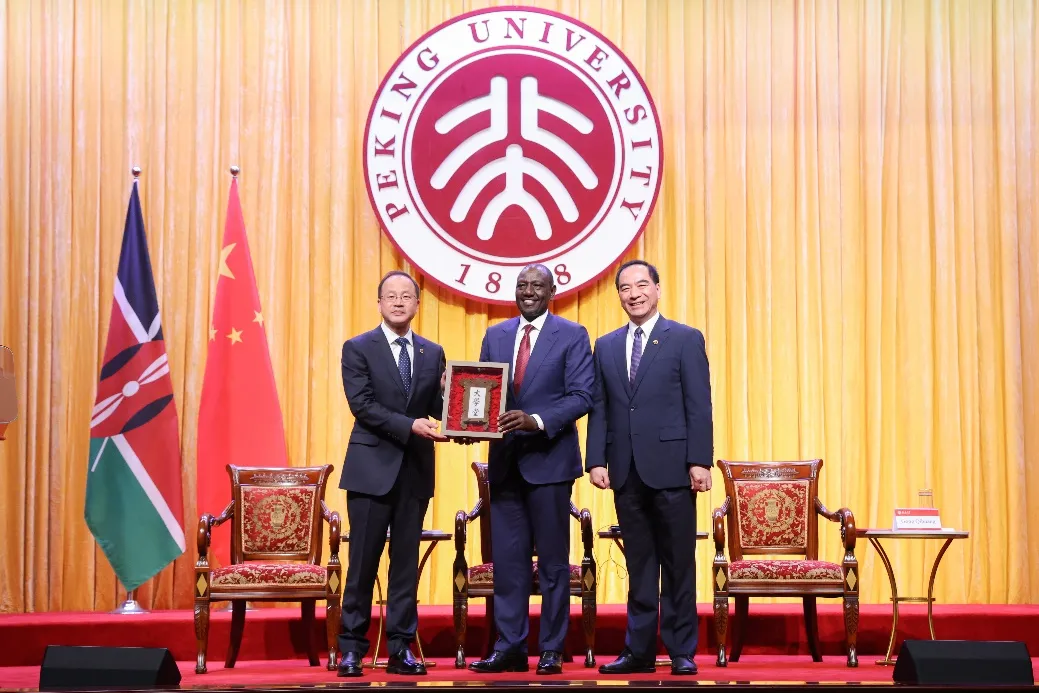 4月23日上午,肯尼亞共和國總統威廉·薩莫伊·魯托(William Samoei Ruto)訪問北京大學并發表演講。總統夫人雷切爾·魯托、內閣首席部長兼外長穆薩利亞·穆達瓦迪等肯尼亞內閣官員,駐華使團代表等陪同來訪;中華人民共和國駐肯尼亞共和國特命全權大使郭海燕,教育部國際合作與交流司副司長趙磊,北京大學黨委書記、校務委員會主任何光彩,校長龔旗煌,校黨委常務副書記、校務委員會副主任陳寶劍,校黨委副書記、校務委員會副主任顧濤等學校領導班子成員與師生代表共同參加活動。演講會在辦公樓禮堂舉行,由副校長方方主持。