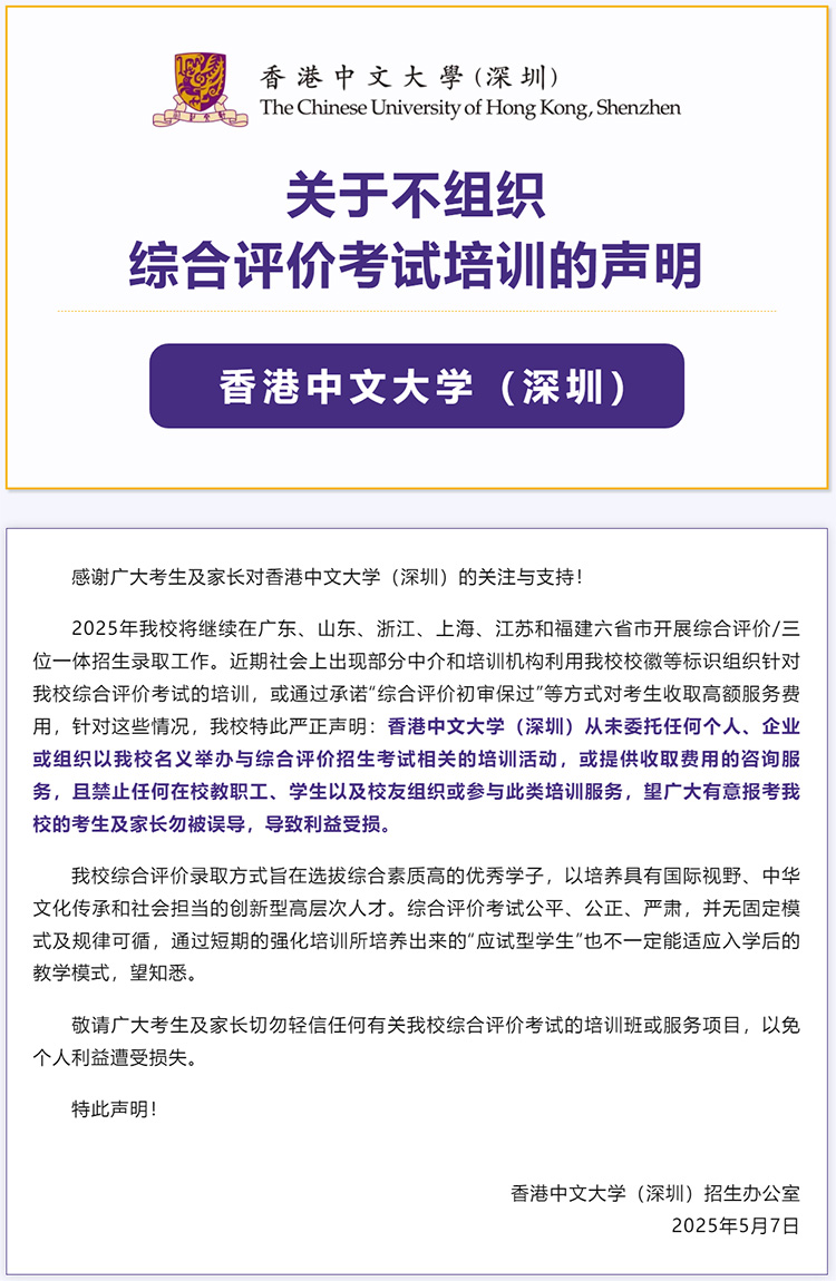 “綜合評價初審保過”是騙局!港中大(深圳)聲明:從未與任何中介合作
