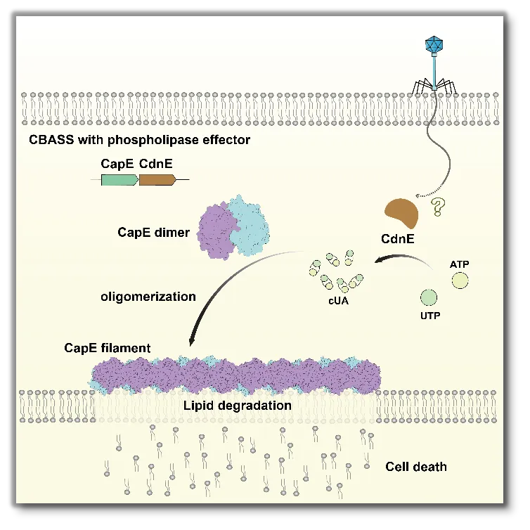 億萬年的時間里,噬菌體與細菌之間不斷進行著攻擊-防御-反擊的戰斗。為了阻止噬菌體入侵,細菌進化出一系列復雜而精巧的抗噬菌體防御系統,又被稱為“原核生物的免疫系統”。其中,基于環狀寡核苷酸的抗噬菌體信號傳導系統(CBASS,cyclic-oligonucleotide-based anti-phage signaling systems)備受關注。該系統在響應噬菌體感染后被激活,通過合成環狀寡核苷酸第二信使分子,迅速放大信號,進而激活下游效應蛋白,引發細胞殺傷作用,導致細菌在噬菌體復制完成前死亡,阻止了噬菌體的復制和擴散。