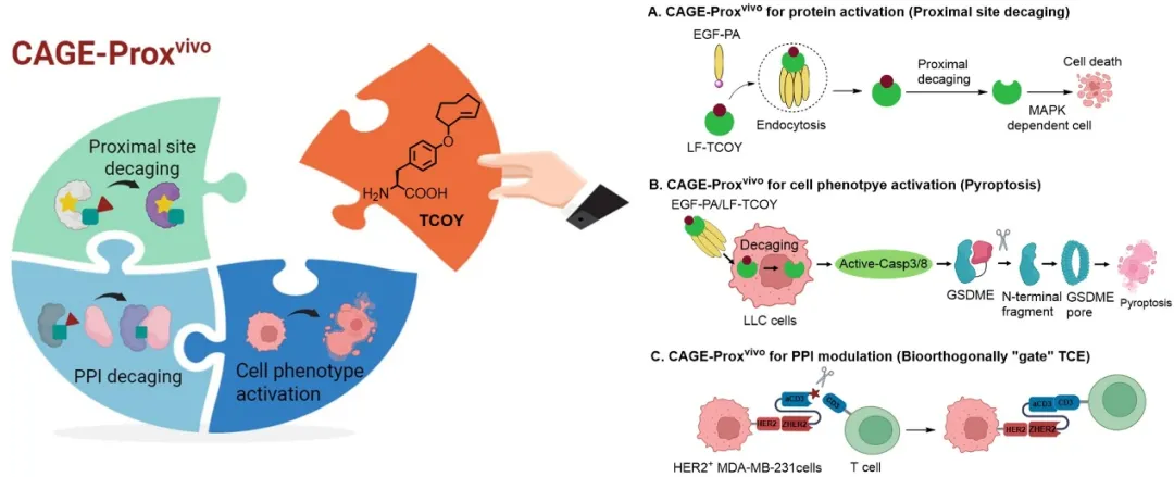 CAGE-Proxvivo蛋白質活體原位激活通用平臺應用:在活體動物中按需激活蛋白質功能;調節細胞表型,誘導腫瘤細胞發生焦亡,增強抗腫瘤免疫反應;精確調節蛋白質-蛋白質相互作用,實現生物正交“門控”雙特異性抗體,用于按需招募和激活T細胞