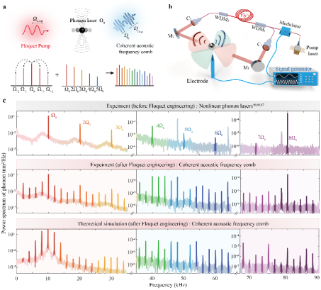 研究表明,通過引入周期性調制的Floquet泵浦信號,非線性聲子激光的模式擴展形成了多個相干頻率成分,且頻率分布與頻率間隔能夠被靈活調控,產生了高性能聲子激光頻率梳,梳齒數量達到40余個,梳齒之間的相位相干性顯著增強。該項研究首創了聲子激光頻率梳生成模式,為其他多種聲學平臺(如囚禁離子體系、微腔體系、冷原子體系等)產生聲子激光頻率梳提供了重要思路。
