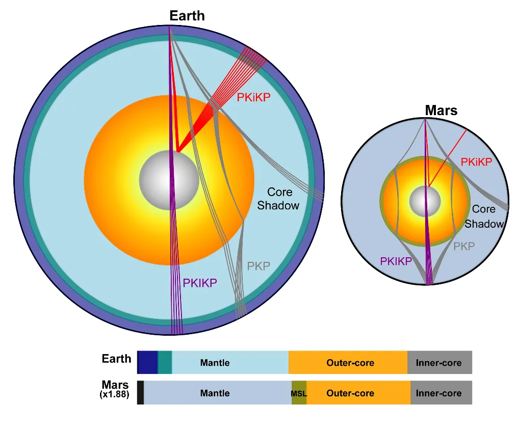 在進一步分析中,研究團隊首次在火震數據中識別出被視為“固態內核標志”的 PKiKP 震相信號(上圖b)。這一發現為火星存在固態內核提供了證據。結合不同火核震相,團隊測得火星固態內核半徑約 600 公里,占火星半徑的 1/5(下圖)。如將火星按比例放大至地球大小,其內外核結構比例與地球高度接近(下圖)。