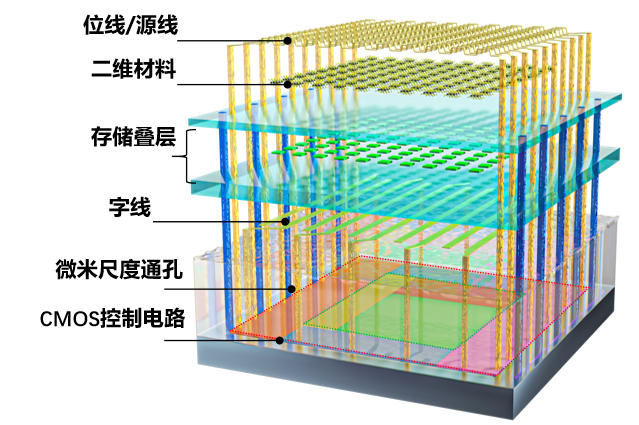 二維-硅基混合架構閃存芯片結構示意圖,包含二維模塊、CMOS控制電路和微米尺度通孔