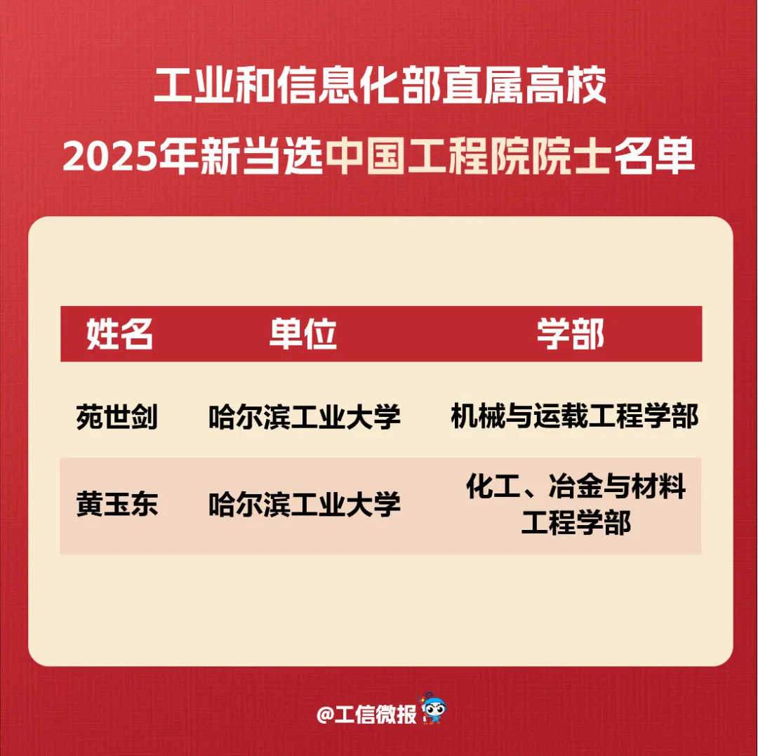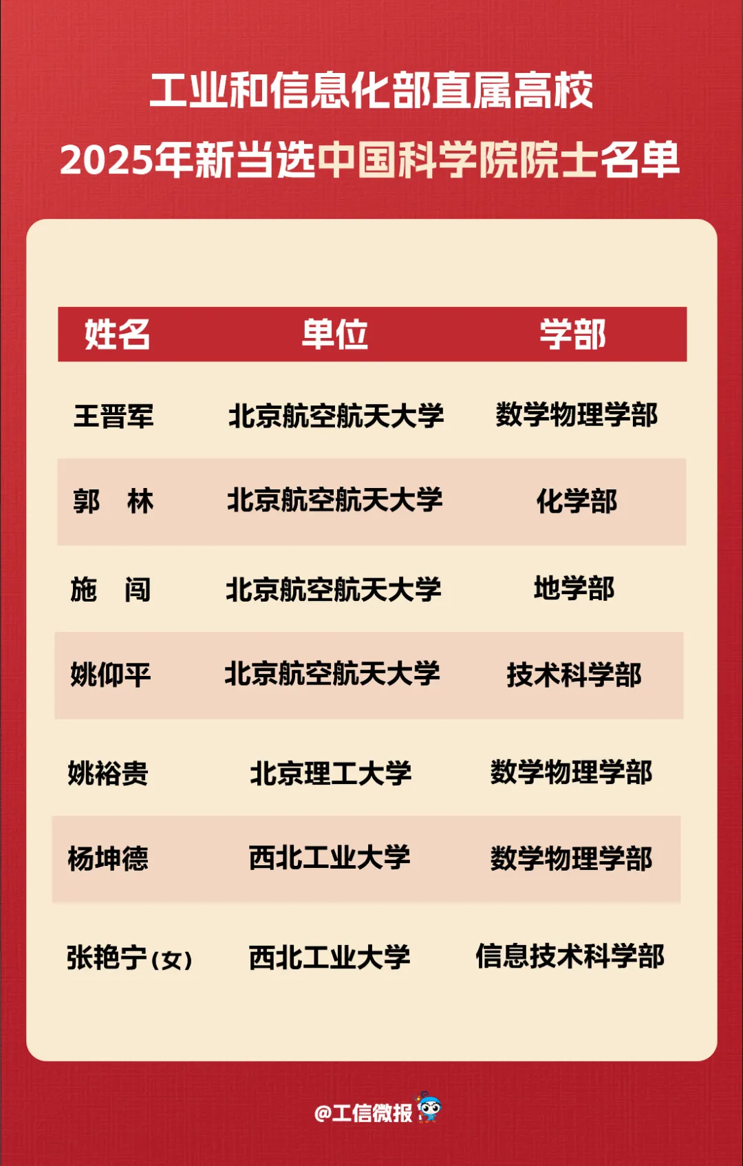 11月21日,中國科學院、中國工程院公布2025年院士增選結果,分別選舉產生中國科學院院士73人、中國工程院院士71人。工業和信息化部直屬高校共9人當選中國科學院、中國工程院院士,名單如下: