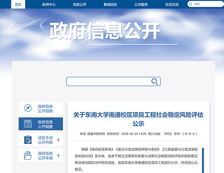2月24日,江蘇南通市教育局官網發布《關于東南大學南通校區項目工程社會穩定風險評估公示》。公示信息顯示,東南大學南通校區選址位于南通市崇川區通富北路東,通滬大道北,崇川路南,觀山路西,總占地面積約1055畝,校舍總建筑面積約52.2萬㎡,地上約45.8萬㎡,地下約6.4萬㎡,建設期約36個月。