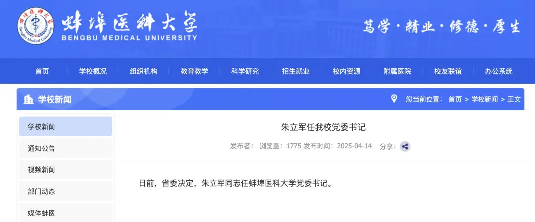 據蚌埠醫科大學官網消息,日前,安徽省委決定,朱立軍同志任蚌埠醫科大學黨委書記。