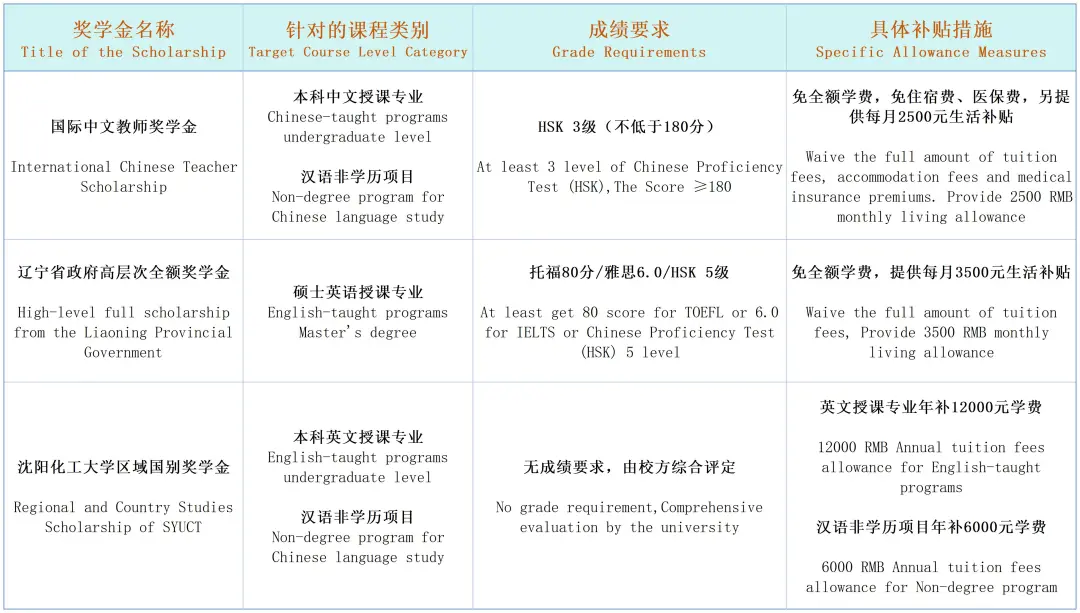 The most popular one called International Chinese Teacher Scholarship, which is basically a “full financial safety net”. If you’re applying for Chinese-taught undergraduate programs (like Chemical Engineering and Technology) or non-degree Chinese language courses, you qualify as long as you reach HSK Level 3 (with a score over 180). This scholarship doesn’t just cover full tuition—it also includes free accommodation and medical insurance, plus a monthly living allowance of 2500 RMB. That’s enough to cover daily costs like meals and transport in Shenyang, so you can study abroad with “zero tuition and low living expenses.”