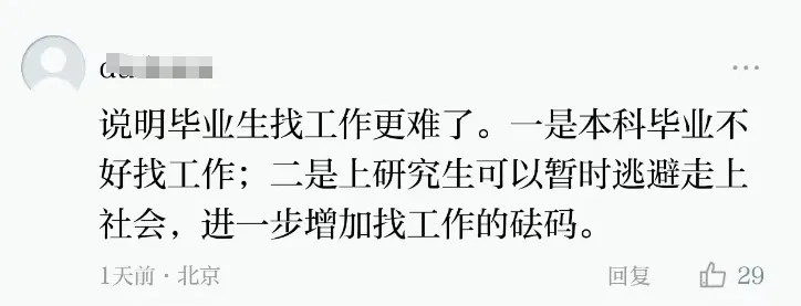 實際上,去年就有相關媒體關注到這一現象,報道稱“北京市28.5萬名高校畢業生中,碩博畢業生人數首次超過了本科生”。