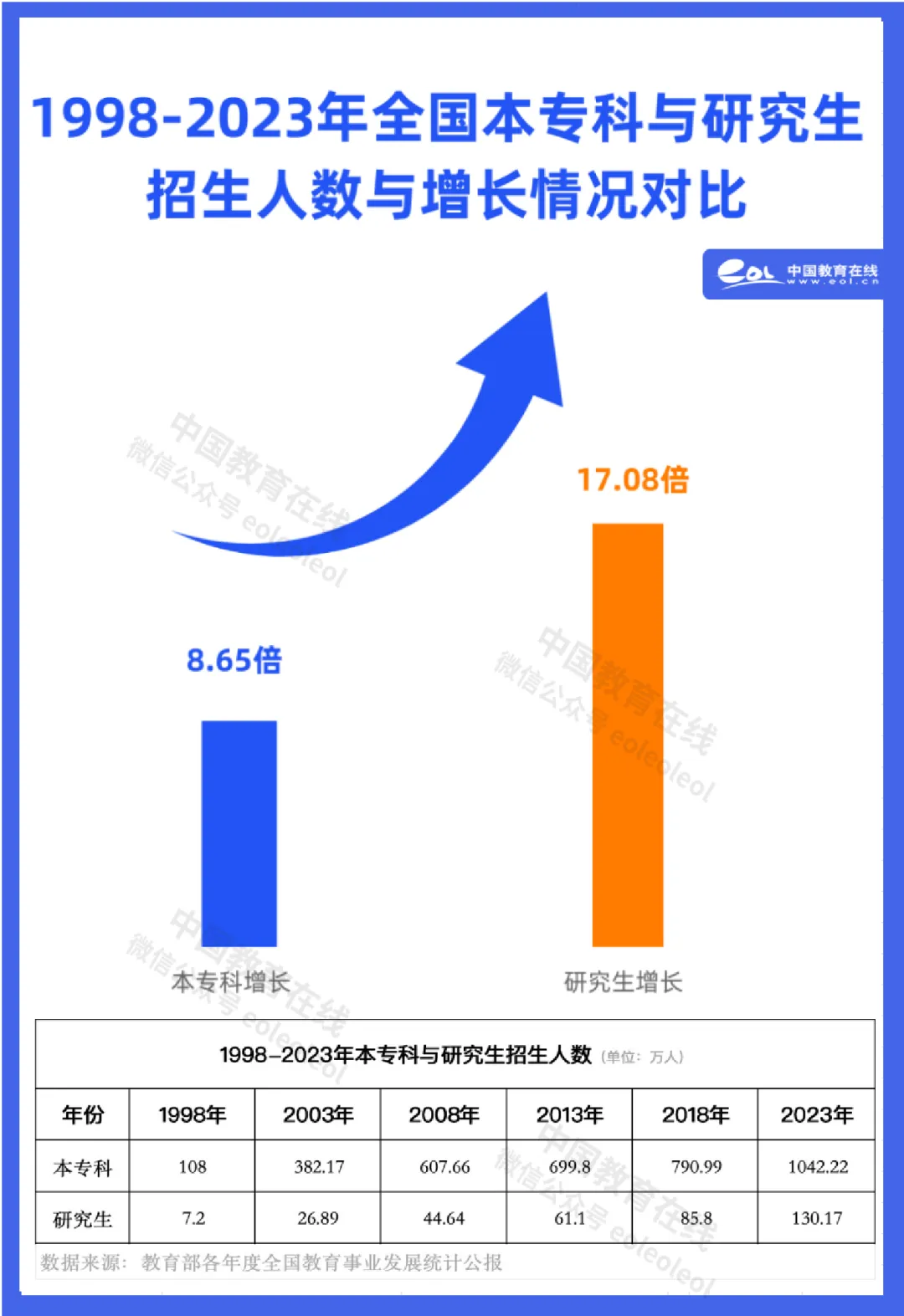 如果對比1998年“大擴招”元年——本專科招生增長近9倍,而研究生的增長則超過17倍!相比之下,研究生的增長比例是遠遠高于本專科的。